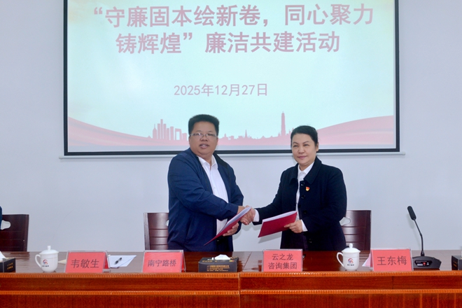 活动伊始,双方举行廉洁共建协议签署仪式。南宁路桥党支部书记、董事长韦敏生与云之龙党总支部书记、集团总裁王东梅签署《廉洁共建协议书》,标志着双方共建关系迈入以“清”护航、以“廉”促行的新阶段。