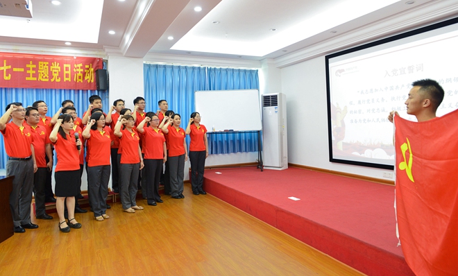 全体党员举起右手,面对党旗,庄严宣誓。铿锵有力的誓言响彻会场,展现出党员同志们坚定的政治信念和矢志不渝的奋斗决心。