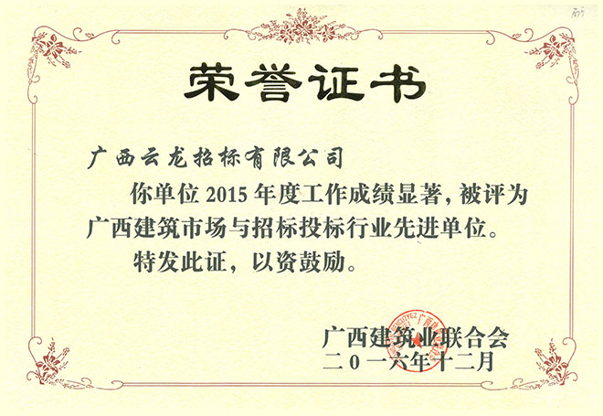 日前,广西建筑业联合会建筑市场与招标投标研究分会2016年年会暨表彰大会在南宁隆重召开,广西云龙招标集团有限公司连续六年荣获“广西建筑市场与招标投标行业先进单位”荣誉称号。同时,陈冰冰、林丽珠、陈超亮、蒋桂兰、龙晓红、劳佣维、韦成晓、高瑾、余晖共八位员工荣获“广西建筑市场与招标投标行业先进个人”称号。