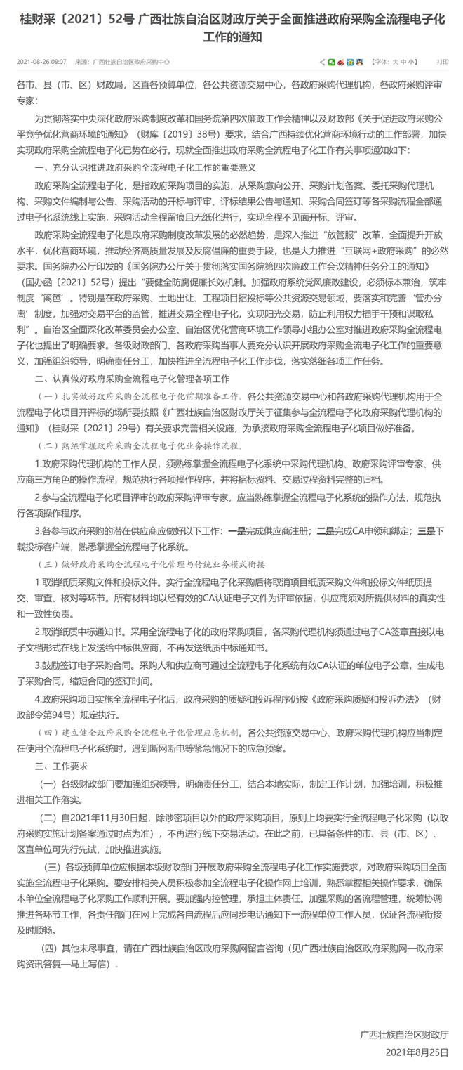 附:《广西壮族自治区财政厅关于全面推进政府采购全流程电子化工作的通知》(桂财采〔2021〕52号 )
