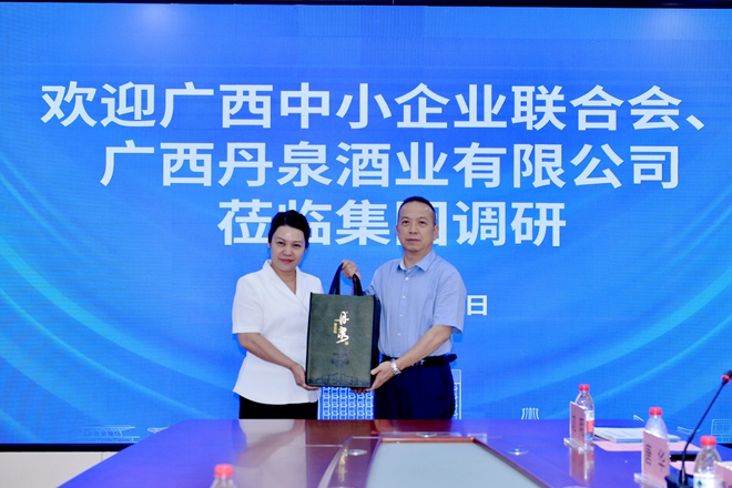 王镱霖总裁对丹泉酒业一行的到来表示欢迎,对广西中小企业联合会的牵线搭桥表示感谢。她说:“丹泉酒业是广西优秀龙头企业代表,在经营管理理念、企业文化建设、党建工作等方面十分值得我们学习。希望双方能发挥自身的优势,加强相互间的交流与学习,共同助力壮美广西建设。”