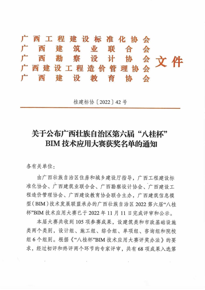 荣获第六届“八桂杯”BIM技术应用大赛“三等奖”