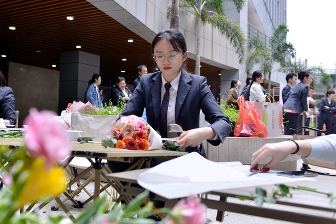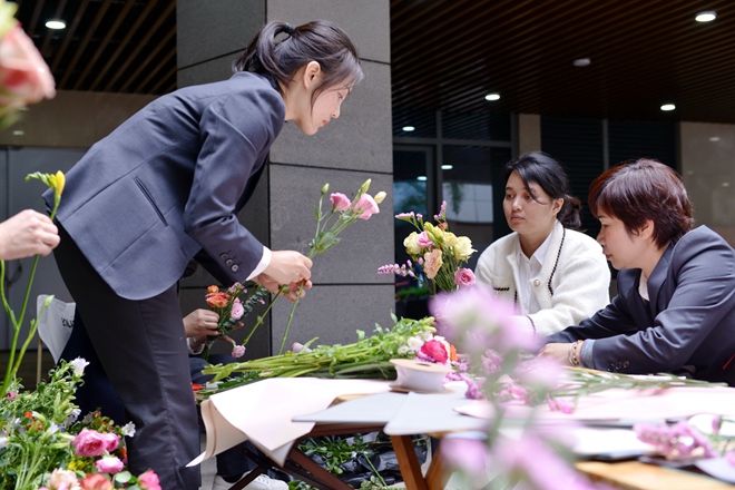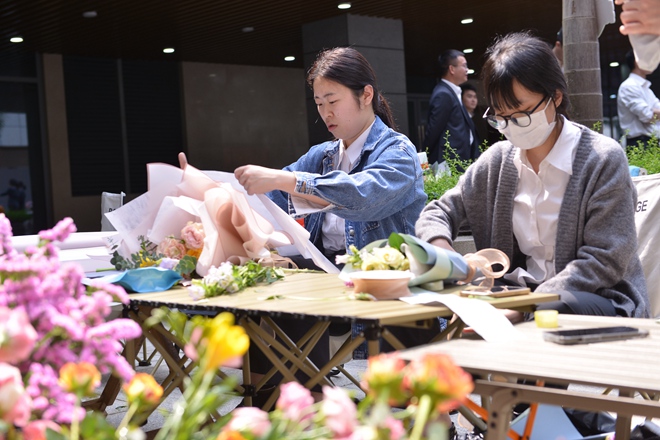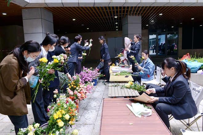 为自己包一束美丽的花,是这个节日最好的礼物。DIY花束前也围满了女职工,大家挑选自己喜欢的鲜花,巧手修枝剪叶,巧妙地创意组合,包扎出一束束错落有致、色彩鲜艳的花束,寄托着大家对美的理解和对幸福的感悟。