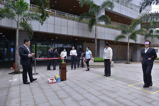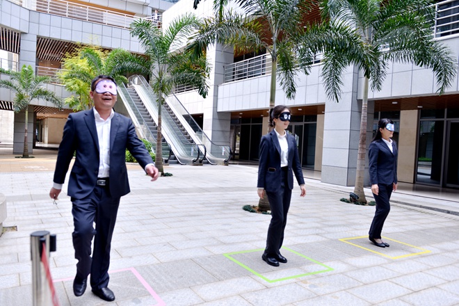 “原地踏步走”需要参与者在方框内,蒙眼行走30秒,不走出方框的,则可以获得一张奖券。一开始,参与者们都信心满满,走着走着就偏离了方向,惹得“围观群众”哈哈大笑。