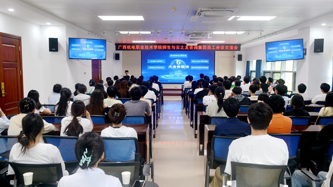 2025年5月8日,广西机电职业技术学院工程造价专业近百名师生走进云之龙咨询集团,开启了一场别开生面的职业探索之旅。校企双方以"理论+实践"为纽带,通过沉浸式参观、行业大咖分享、互动研讨等环节,为青年学子搭建起从课堂到职场的"成长阶梯"。