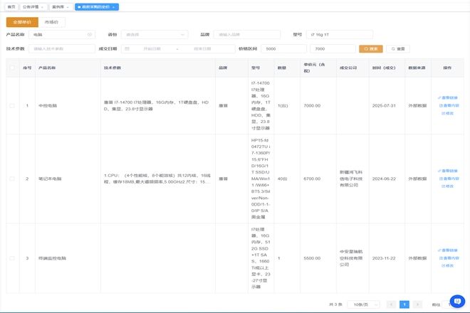内置全国SKU级别政府采购历史成交数据(可直接根据采购标的主要参数、标的名称、地区、参考品牌和型号直接查找到政府采购成交历史数据),涵盖成交金额、法规定额、电商价格、市场主体报价等多维度数据,支持按品牌、规格、参数、地区快速检索,一键生成数字化分析报告,精准估算实时预算,让预算决策有数据可依、有法规可循,既杜绝财政资金浪费,又规避履职风险,完美契合“过紧日子”要求与新政导向。