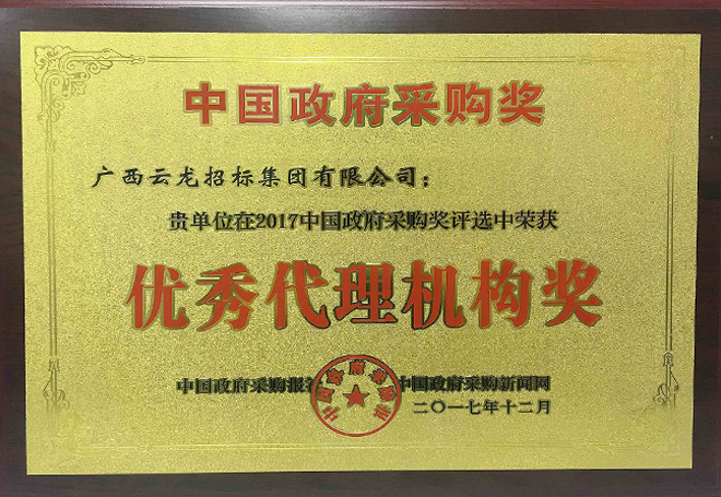 2018年1月4日-5日,2017年中国政府采购峰会在江苏南京举行,出席此次峰会的领导有财政部领导,中直机关采购中心,中央国家机关政府采购中心及各省、自治区、直辖市等各级财政厅(市、局)政府采购处,采购中心的代表,以及来自全国各地相关代理机构、企业家代表及专家代表等,云之龙集团总裁王镱霖、副总裁谢志红参加了此次峰会。在当晚的中国政府采购奖颁奖仪式上云之龙招标集团有限公司(曾用名:广西云龙招标集团有限公司)荣获“中国政府采购优秀代理机构”奖,这是自2012年开设此奖项以来,云之龙集团连续四年获此殊荣,也是广西区内唯一一家获此奖项的单位。