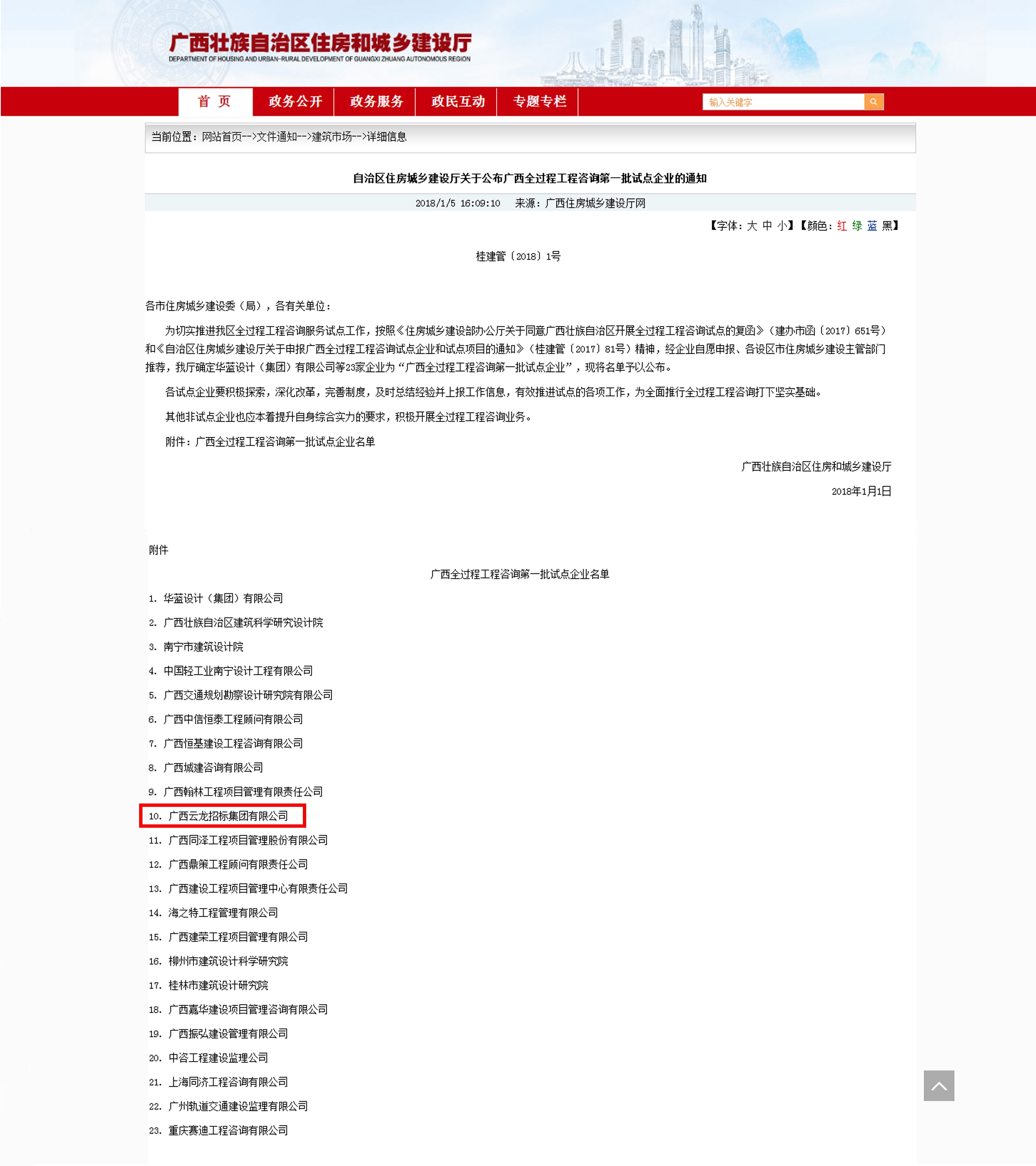 2018年1月5日,广西壮族自治区住房和城乡建设厅下发了《自治区住房城乡建设厅关于公布广西全过程工程咨询第一批试点企业的通知》(桂建管〔2018〕1号),云之龙招标集团有限公司入选广西全过程工程咨询第一批试点企业。据了解,此次全区共有23家企业入选。